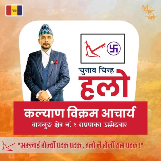 काठमाडाैं । आगामी प्रतिनिधिसभा निर्वाचनका लागि बागलुङ क्षेत्र नम्बर १ मा राष्ट्रिय प्रजातन्त्र पार्टी (राप्रपा) का तर्फबाट कल्याण विक्रम आचार्यले उम्मेदवारी दर्ता गराएका छन् । ३१ बर्षिया आचार्य सबैभन्दा कान्छा युवा उमेद्वार हुन् । ११ जना उमेद्वारहरु मध्ये कल्याण सबैभन्दा कान्छा हुन भने उनीभन्दा मंगोल नेशनल अर्गनाईजेसनकी उमेद्वार...