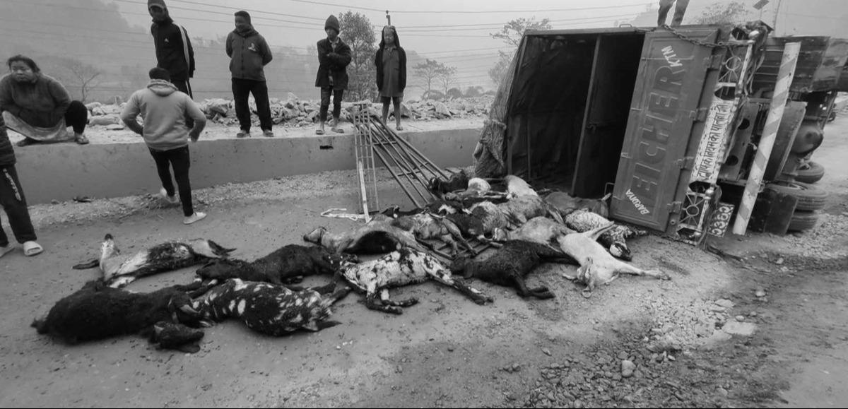 चितवनमा मिनी ट्रक दुर्घटना हुँदा १९ वटा खसीबोका मरे