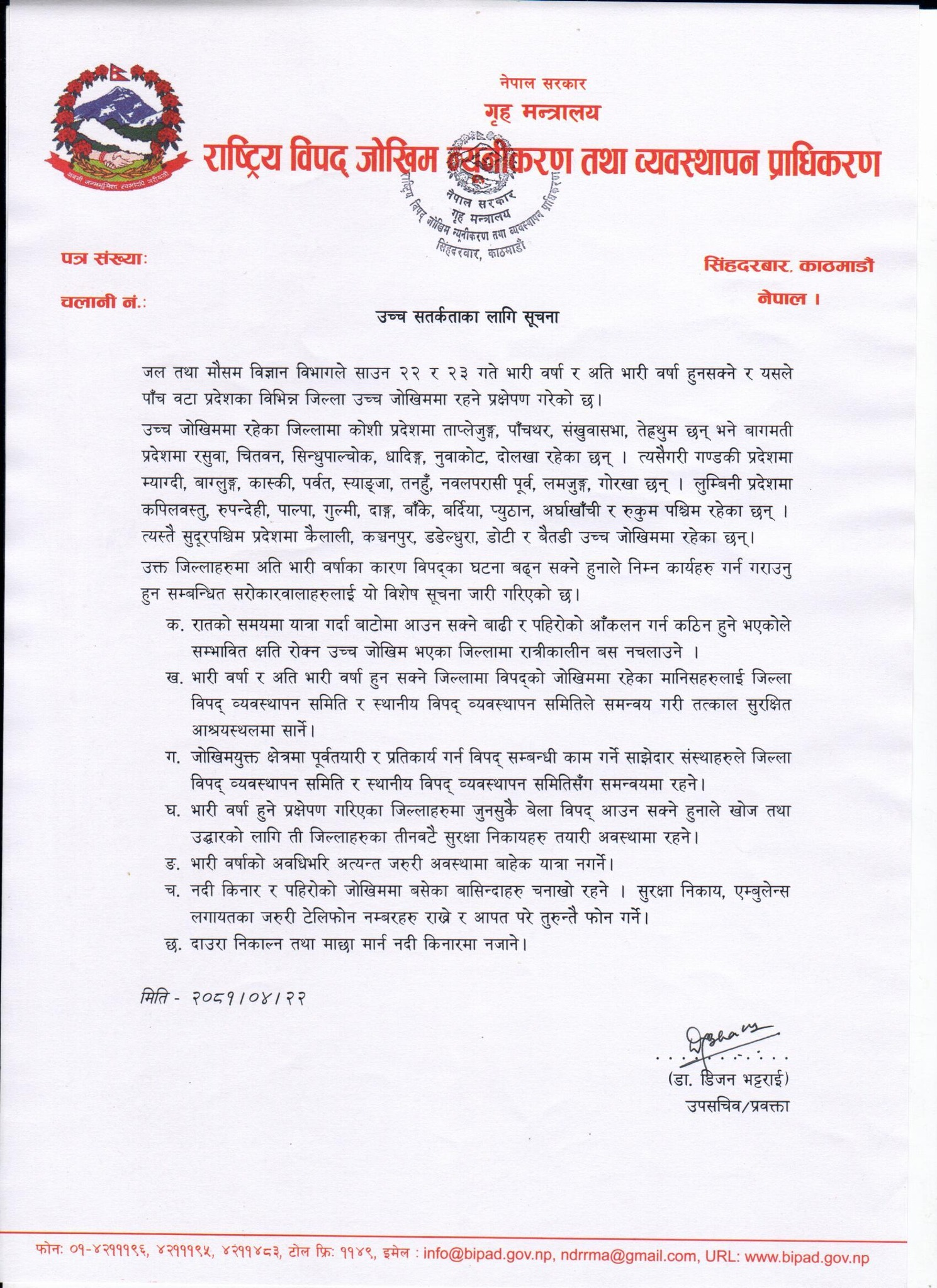 राष्ट्रिय विपद जोखिम न्यूनीकरण तथा व्यवस्थापन प्राधिकरणले मंगलबार र भोलि बुधबार भारीदेखि अति भारी वर्षा हुनसक्ने चेतावनीका बीच सम्भावित क्षति रोक्न उच्च जोखिमको सूचीमा रहेका जिल्लामा रात्रिकालीन बस नचलाउन भनेको हो ।