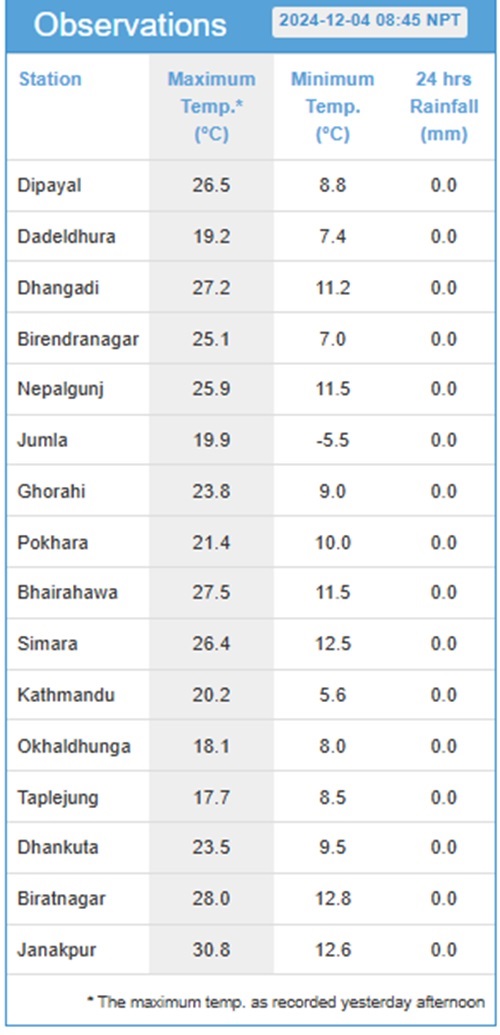 महाशाखाका अनुसार आज जुम्लाको न्यूनतम तापक्रम सबैभन्दा कम रहेको छ । जुम्लामा आज माइनस ५.५ डिग्री सेल्सियस रहेको छ । यसपछिको कम तापक्रम काठमाडौंको हो ।