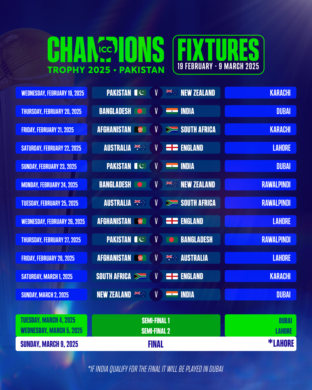 यसैगरी भारत र पाकिस्तानबीचको खेल फेब्रुअरी २३ मा दुबइमा हुनेछ । भारतले आफ्ना सबै खेल दुबइमा खेल्नेछ । सेमिफाइनल पनि दुबईमै हुनेछ । यदि भारत फाइनलमा पुग्यो भने यो खेल पनि दुबईमा हुनेछ । १० खेल भने पाकिस्तानमा हुनेछन् ।