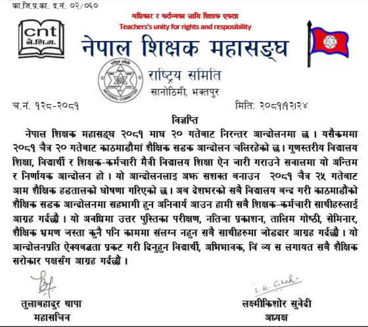 नेपाल शिक्षक महासंघको राष्ट्रिय समितिको विज्ञप्तिमा लेखिएको छ, ‘यो आन्दोलनलाई सशक्त बनाउन २०८१ चैत २५ गतेबाट आम शैक्षिक हड्तालको घोषणा गरिएको छ । महासंघले आन्दोलनको अवधिमार उत्तर पुस्तिका परीक्षण, नतिजा प्रकाशन, तालिम गोष्ठी, सेमिनार, शैक्षिक भ्रमण जस्ता कुनै पनि काममा संलग्न नहुन पनि आग्रह गरेको छ ।