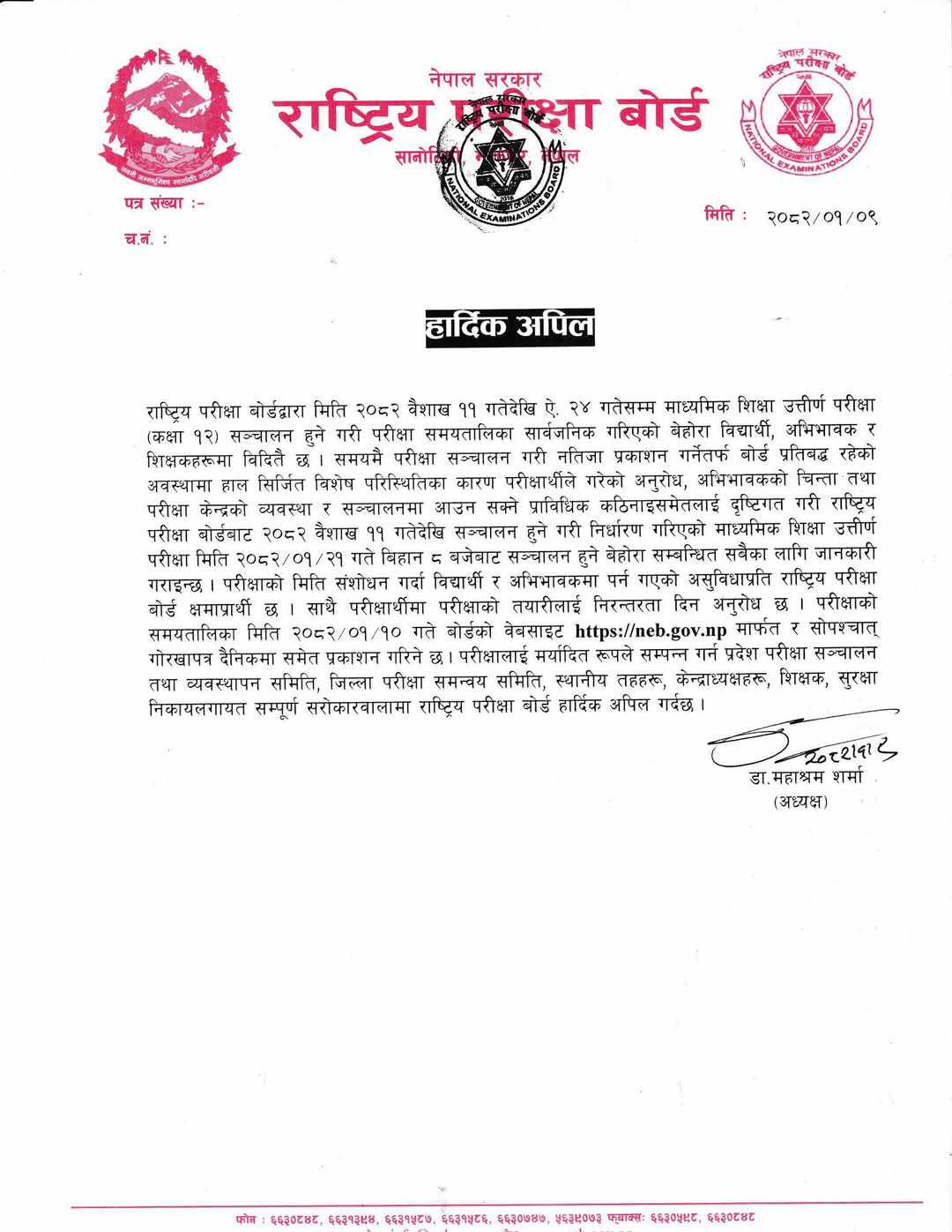 काठमाडौं । राष्ट्रिय परीक्षा बोर्डले कक्षा १२ को वार्षिक परीक्षा वैशाख २१ गतेदेखि गर्ने गरी सारेको छ ।