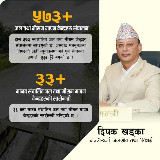काठमाडौं । ऊर्जा, जलस्रोत तथा सिँचाइमन्त्री दिपक खड्काले ५७३ वटा जल तथा मौसम मापन केन्द्रहरु सफलतापूर्वक सञ्चालनमा आएको बताएका छन् । उनले यी केन्द्रहरूले मनसुनजन्य विपद् न्यूनीकरणका लागि पूर्व चेतावनी प्रणालीलाई अझ सशक्त र प्रभावकारी बनाउने बताएका हुन् ।
