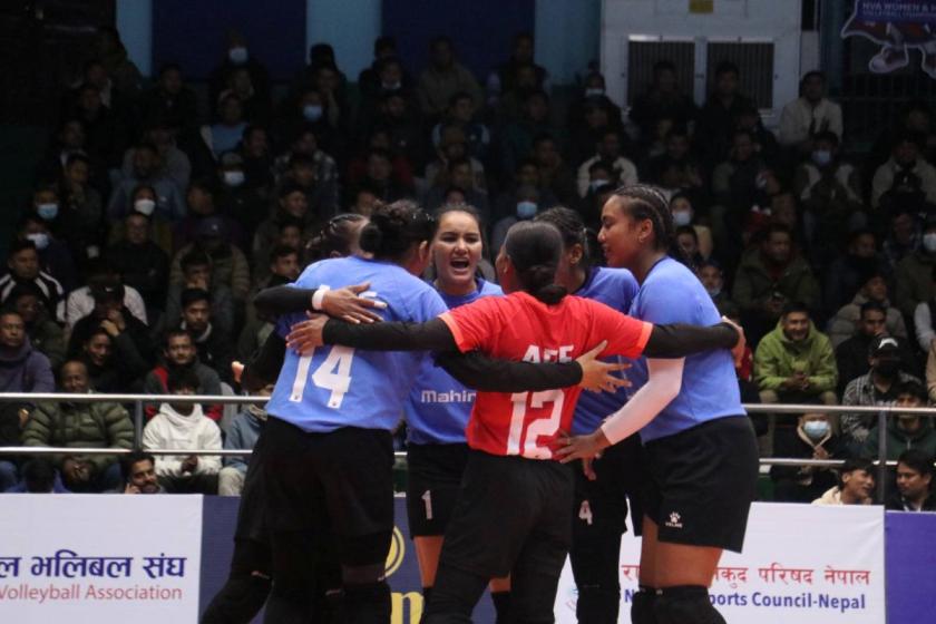 काठमाडाैं । साविक विजेता नेपाल पुलिस क्लब एपिएफ क्लबलाई हराएर नवौँ एनभिए महिला तथा पुरुष भलिबल च्याम्पियनसिपको सेमिफाइनलमा प्रवेश गरेको छ। त्रिपुरेश्वरस्थित राष्ट्रिय खेलकुद परिषद् (राखेप) को कभर्ड हलमा पुलिसले एपिएफलाई ३–२ ले हराएर महिला भलिबलको अन्तिम चारमा पुगेको हो । पुलिसले लगातार दोस्रो खेलमा जित हात पारेको हो । समूह ‘बी’ मा एक खेल गुमाए पनि अघिल्लो दुई खेल जितेको एपिएफ पनि अन्तिम चारमा पुगेको छ ।