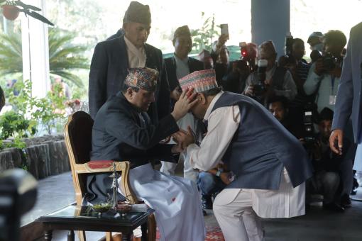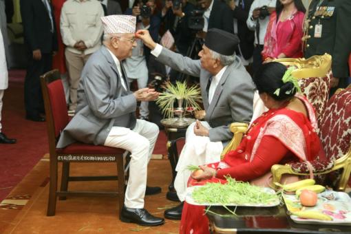 प्रधानमन्त्री ओलीद्वारा राष्ट्रपति पौडेलको हातबाट दशैँको टिका ग्रहण