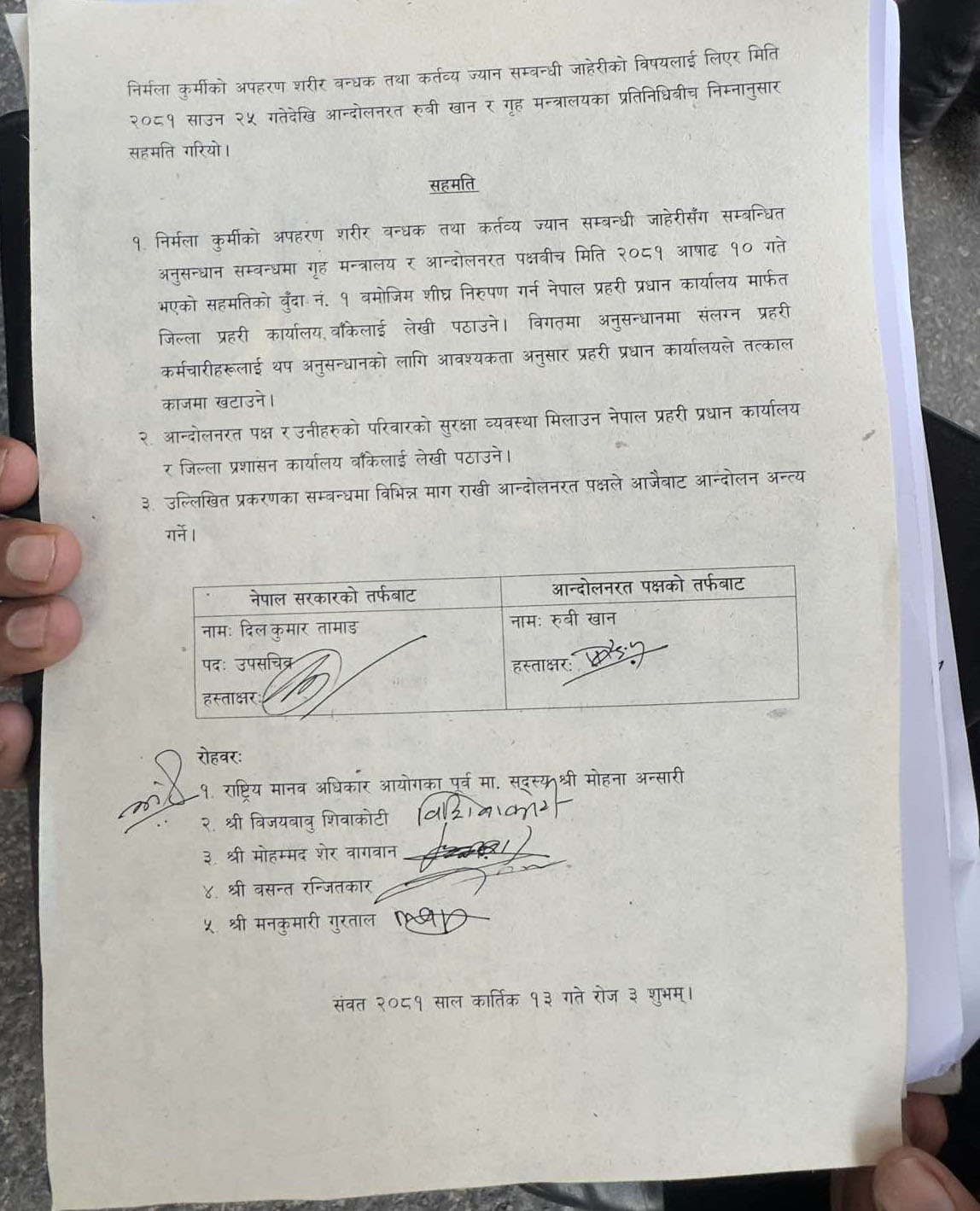 सहमतिपत्रमा मन्त्रालयका उपसचिव दिलकुमार तामाङ र आन्दोलनरत पक्षका तर्फबाट रुबी खानले हस्ताक्षर गरेका छन् । उक्त सहमतिसँगै आन्दोलनको कार्यक्रमसमेत स्थगित भएको छ ।