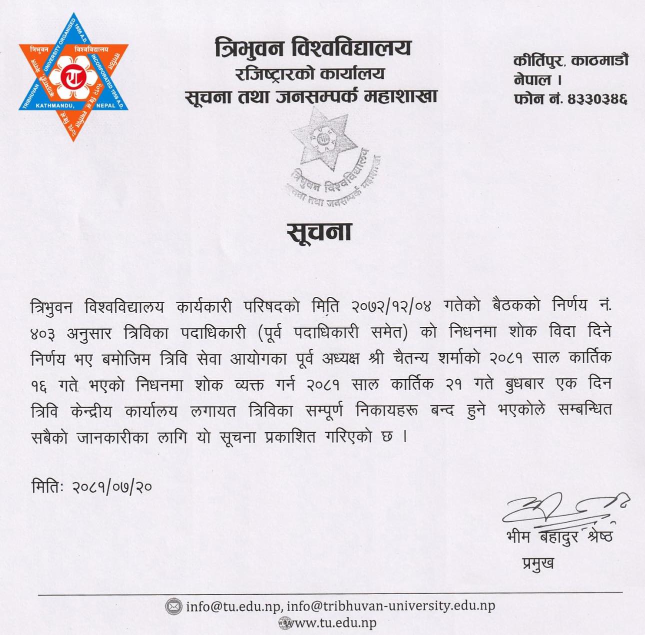 त्रिवि कार्यकारी परिषद्को २०७२ चैत ४ गते बसेको बैठकको निर्णय नम्बर ४०३ ले त्रिविका पदाधिकारी ९पूर्वपदाधिकारी समेत०को निधनमा शोक बिदा दिने निर्णय गरेको थियो । सोही आधारमा एक दिन शोक बिदा दिइएको जनाइएको छ ।