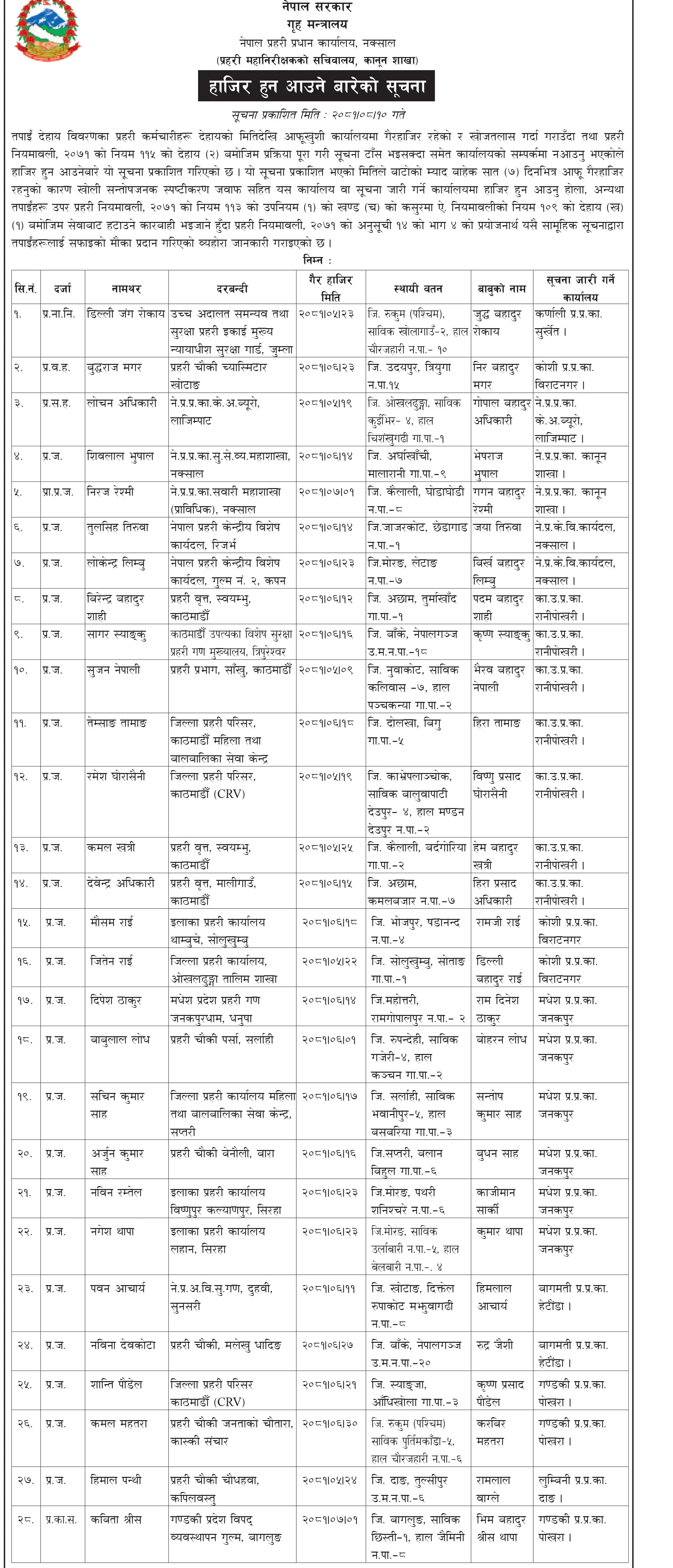 केही समयदेखि आफूखुसी कार्यालयमा गैरहाजिर रहेको र खोजतलास गर्दा सम्पर्कमा नआएको भन्दै प्रहरी प्रधान कार्यालयको कानुन शाखाले ७ दिने सूचना प्रकाशन गरेको छ ।