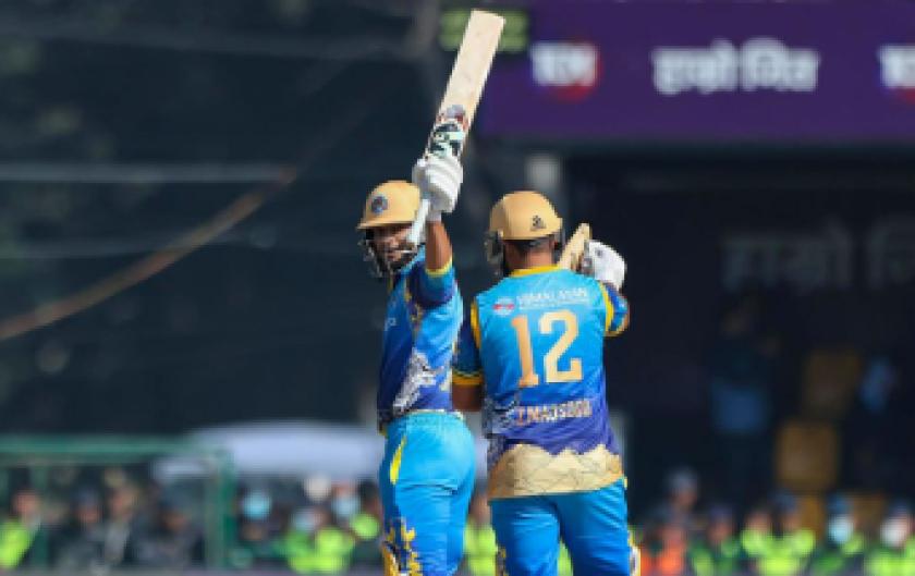 मक्सुदले ११ बल खेल्दै १ चौका मदतमा अविजित १४ रन जोडे । चाडविक वाल्टनले २१, बाबा रहायतले १३ र गुल्सन झा ले २ रन जोडे । अर्जुन घर्ती ४ रनमा आउट भए भने ओपनर देव खनालले खाता खोल्न सकेनन् । बलिङमा काठमाडौंका जेरार्ड एरासमसले २ तथा करण केसी, नाथन सोटर र दिपेश कँडेलले १/१ विकेट लिए ।