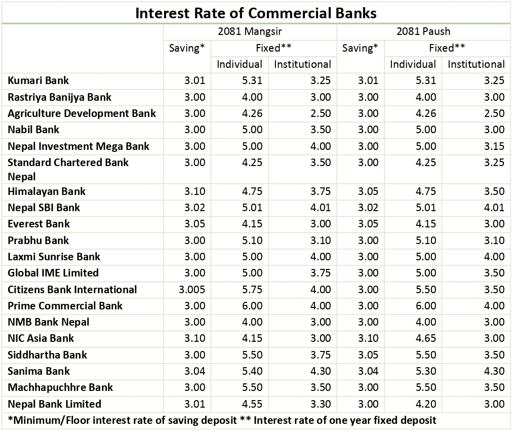 साधारण बचत खातातर्फ तीनवटा बैंकले ब्याजदर घटाएका छन् भने एउटा बैंकको ब्याजदर सामान्य बढेको छ। त्यस्तै, एकवर्षे व्यक्तिगत मुद्दती खाता अन्तर्गत तीन वटा बैंकको ब्याजदर घटाउँदा एउटा बैंकको ब्याजदर मात्रै बढेको छ । एकवर्षे संस्थागत मुद्दती खातामा आठवटा बैंकले ब्याज घटाएका छन् ।
