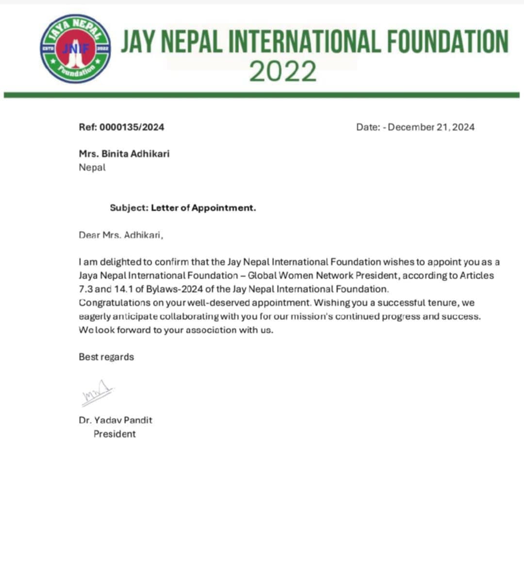 फाउण्डेशनले फाउण्डेशनको नियमावली २०२४ को धारा ७.३ र १४.१ बमोजिम अधिकारीलाई संस्थाको अध्यक्षमा नियुक्ति गरेको हो ।