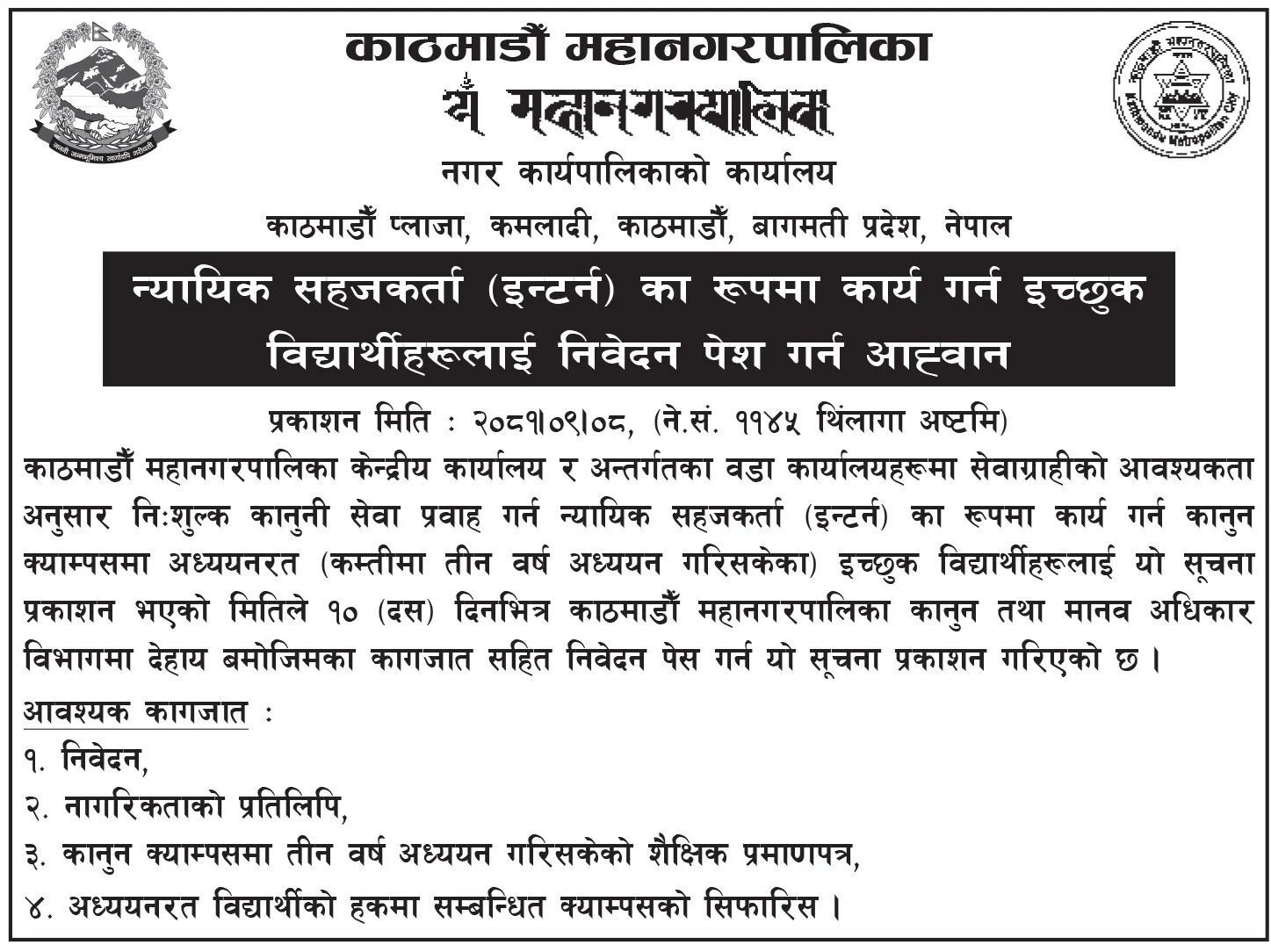 महानगरपालिका केन्द्रीय कार्यालय र अन्तर्गतका वडा कार्यालयमा सेवाग्राहीको आवश्यकता अनुसार निःशुल्क कानूनी सेवा प्रवाह गर्न न्यायिक सहजकर्ता (इन्टर्न) का रूपमा काम गर्न आवेदन आह्वान गरिएको हो ।