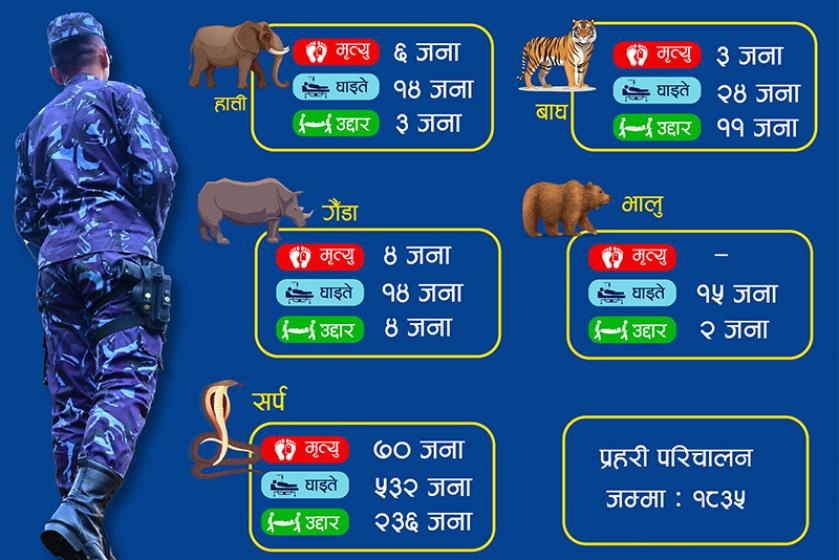 चालु आर्थिक वर्षको ५ महिनामा सर्प, बाघ, गैँडा, हात्ती र भालुको आक्रमणबाट ८३ जनाएको मृत्यु भएको प्रहरीको तथ्यांक छ । यो अवधिमा ५ सय ९९ जना घाइते भएका छन् ।