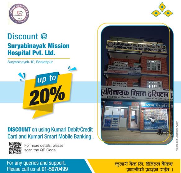 यस सम्झौता बमोजिम सूर्यविनायक मिसन हस्पिटलबाट प्रदान गरिँदै आएका सेवामा ग्राहकलाई प्रयोगशाला परीक्षण, एक्स-रे, यूसीजी तथा औपीडी टिकटमा २० प्रतिशत छुट र औषधिमा १०प्रतिशत छुट दिने भएको हो ।
