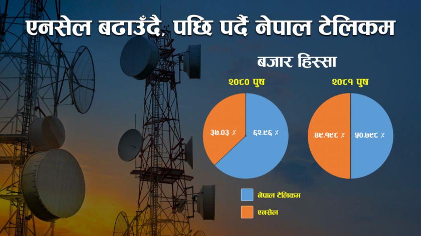 सरकारी स्वामित्वको नेपाल दूरसञ्चार कम्पनी लिमिटेड (नेपाल टेलिकम) का ग्राहक अघिल्लो वर्षको पुसमा एनसेलका २ करोड २० लाख प्रयोगकर्ता रहेकोमा यो वर्षको पुससम्म १ करोड ५२ लाख पुगेका छन् । तथ्यअनुसार नेपाल टेलिकमका प्रयोगकर्ता घट्दा एनसेलले बजार हिस्सा बढाउँदै लगेको हो । नेपाल टेलिकमजस्ता सरकारी स्वामित्वमा रहेका कम्पनीहरूमा सर्वसाधारणको २५ प्रतिशत स्वामित्व वृद्धि गर्ने सरकारले तयारी गर्दा पनि उल्लेख्य रुपमा प्रयोगकर्ता बढ्न सकिरहेका छैनन् । हाल टेलिकमको ९२ प्रतिशत शेयर सरकारको र ८ प्रतिशत मात्रै सर्वसाधारणको छ । नेपाल टेलिकमको अघिल्लो महिना सम्पन्न वार्षिकोत्सव कार्यक्रममा सञ्चारमन्त्री पृथ्वीसुब्बा गुरुले अब कम्तीमा पनि २५ प्रतिशत सर्वसाधारणको सेयर पु¥याउने घोषणा गर्नुभएको थियो ।