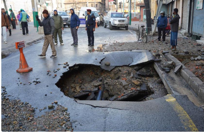 काठमाडौं । काठमाडौंको थापाथली चोकबाट नर्भिक अस्पतालतर्फ जाने सडकमा मेलम्ची खानेपानीको पाइपलाइन फुट्दा सडक क्षतिग्रस्त भएको छ ।