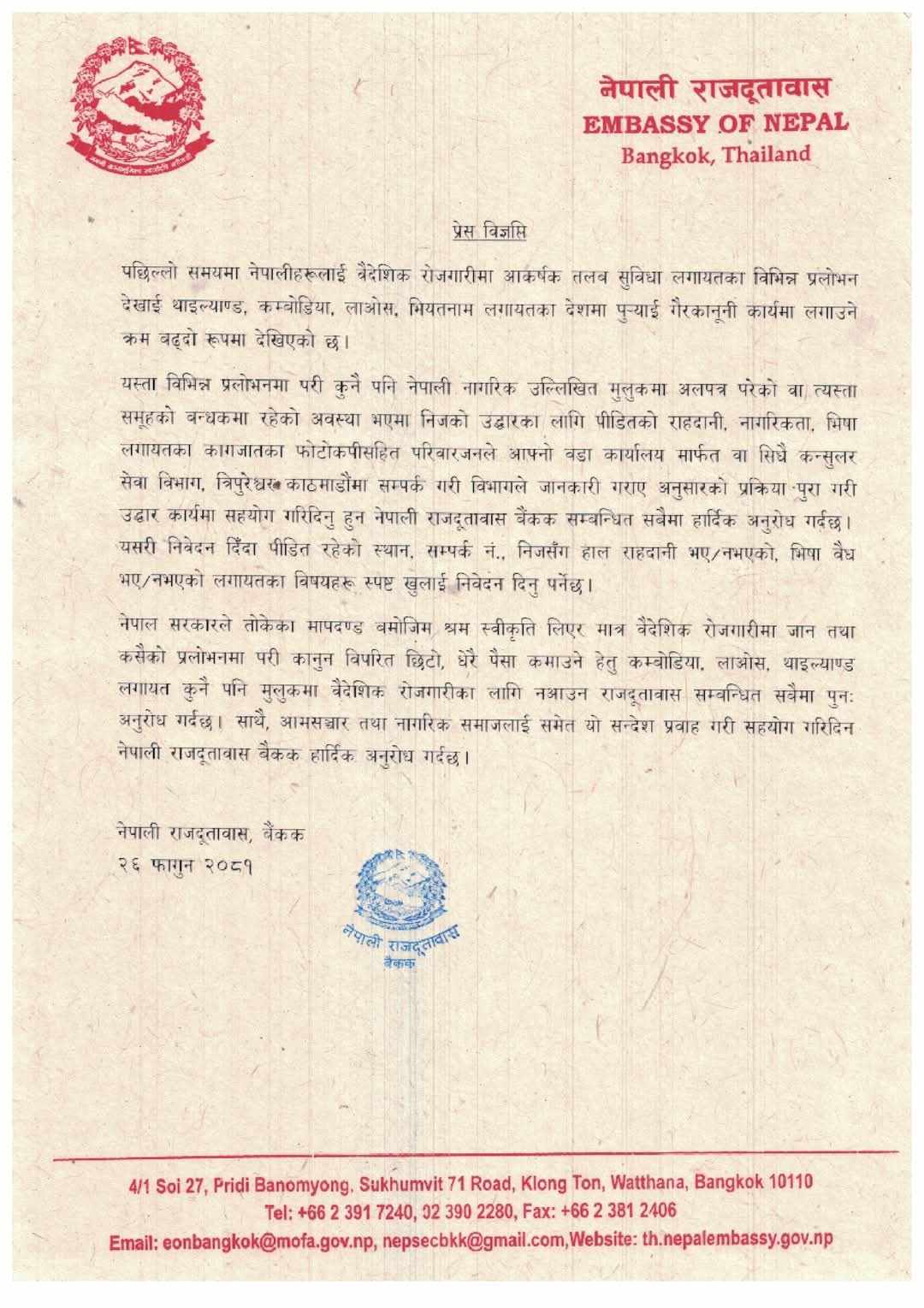 काठमाडाैं । थाइल्याण्डका राजदूत धनबहादुर ओलीले पछिल्लो समय नेपाली हरुलाई वैदेशीक रोजगारीमा आर्कषक तलब सुविधा लगाएतका विभिन्न प्रलोभनमा पारी गैर कानुनी कार्यमा लगाउने क्रम बढ्दो रुपमा देखिएको बताएका छन् । उनले एक विज्ञप्ती जारी गर्दे यस्तो बताएका हुन ।