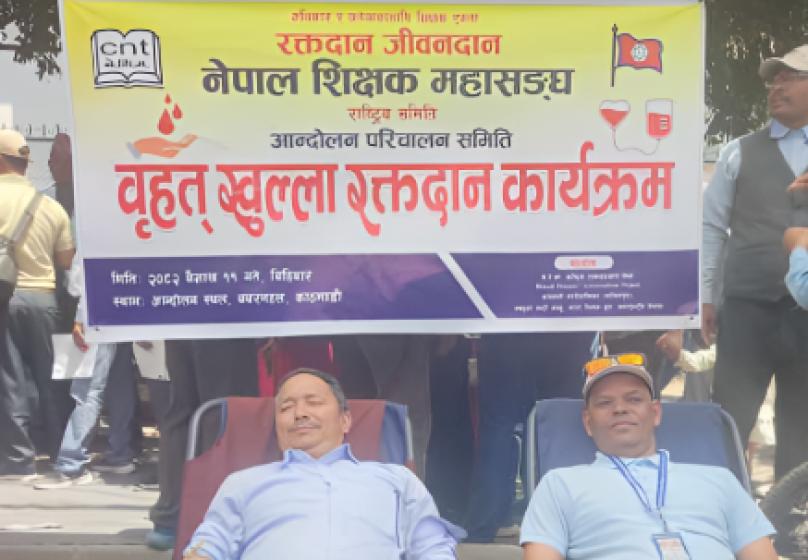 नेपाल शिक्षक महासंघको आयोजनामा बिहिबार बरबरमहलमा रक्तदान गर्न थालेका हुन् । नेपाल रेडक्रस सोसाइटीको समन्वयमा रक्तादान भइरहेको महासंघका अध्यक्ष लक्ष्मीकिशोर सुवेदीले जानकारी दिए ।