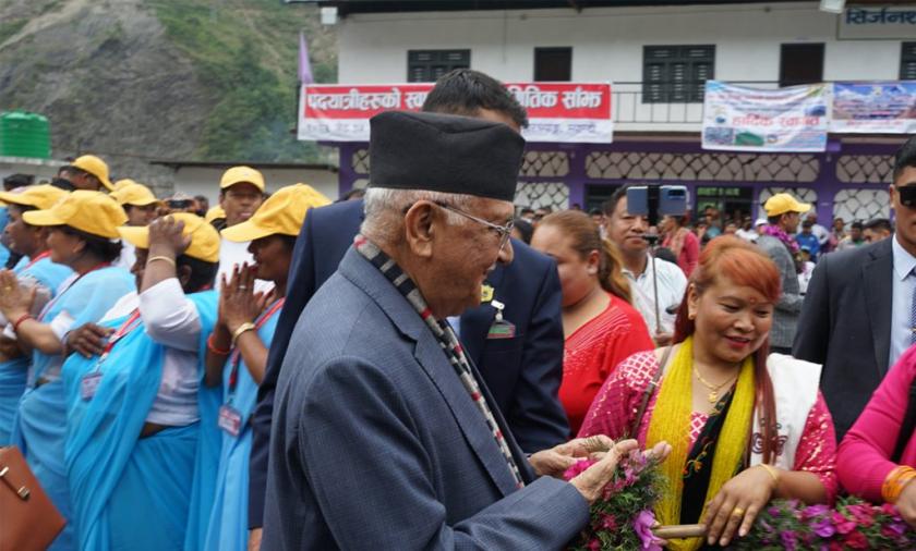 म्याग्दी । प्रधानमन्त्री केपी शर्मा ओली म्याग्दीको अन्नपूर्ण गाउँपालिका–४ नारच्याङ आइुपुग्नु भएको छ । अन्नपूर्ण हिमाल आरोहण भएको ७५औं वार्षिकोत्सवमा अन्नपूर्ण गाउँपालिकाले आयोजना हीरक महोत्व उद्घाटन गर्न प्रधानमन्त्री यहाँ आउनुभएको हो ।