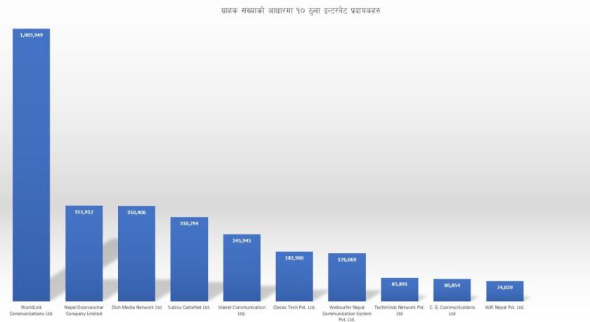 नेपाल दूरसञ्चार प्राधिकरणले सार्वजनिक गरेको पछिल्लो तथ्यांकका आधारमा सरकारी कम्पनीलाई समेत उछिन्दै इन्टरनेट सेवामा वल्र्डलिंक कम्युनिकेसन लिमिटेड सबैभन्दा अगाडि देखिएको छ । कम्पनीका इन्टरनेट सेवाका ग्राहक संख्या १० लाख ३ हजार ९ सय ४९ पुगेका छन् ।