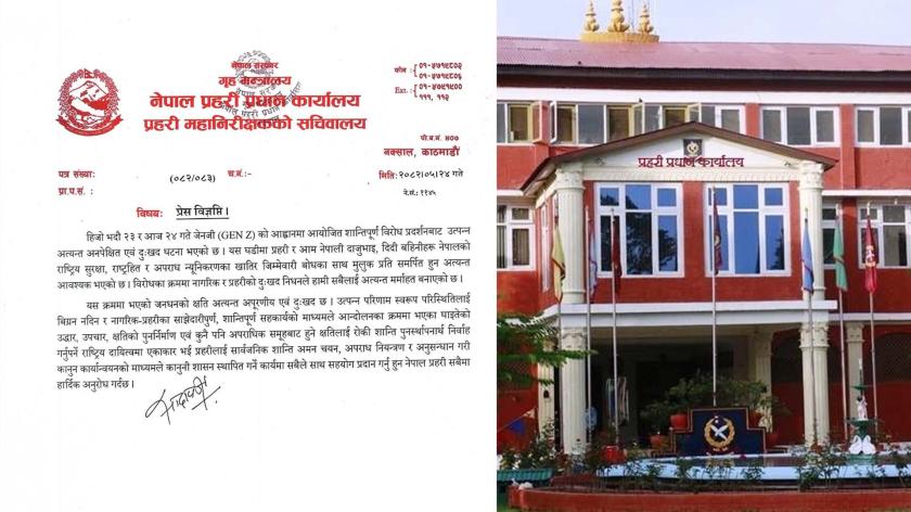मङ्गलबार राति प्रहरी प्रधान कार्यालयले प्रेस विज्ञप्तिमार्फत सोमबार जेन–जीको आह्वानमा आयोजित शान्तिपूर्ण विरोधप्रदर्शनका क्रममा भएका दुःखद् घटनाबाट प्रहरी सङ्गठन मर्माहत भएको जनाएको छ ।