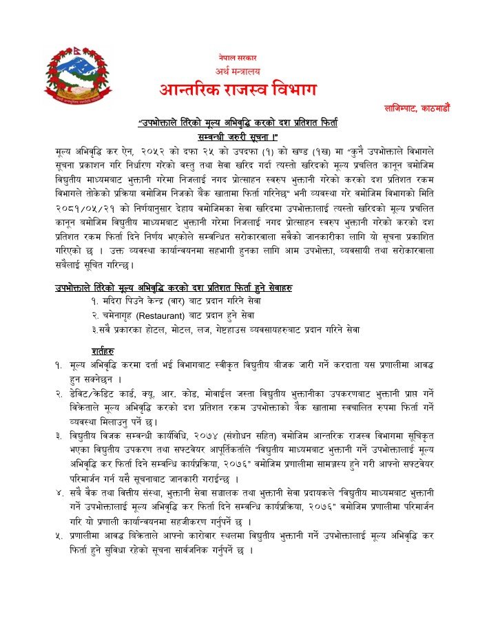 विभागले भदौ २१ गते मूल्य अभिवृद्धि कर ऐन, २०५२ को दफा २५ को उपदफा (१) को खण्ड (ख) मा कुनै उपभोक्ताले विभागले सूचना प्रकाशन गरी निर्धारण गरेको वस्तु तथा सेवा खरिद गर्दा त्यस्तो खरिदको मूल्य प्रचलित कानुन बमोजिम विद्युतीय माध्यमबाट भुक्तानी गरेमा निजलाई नगद प्रोत्साहन स्वरूप भुक्तानी गरेको करको दश प्रतिशत रकम विभागले तोकेको प्रक्रिया बमोजिम निजको बैंक खातामा फिर्ता गरिनेछ भनी व्यवस्था गरे बमोजिम निर्णय गरेको थियो ।