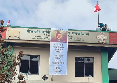पार्टीको झण्डा र बीपीको तस्वीर राख्दै कांग्रेस कार्यकर्ताले भने, हामी उठ्नेछौं